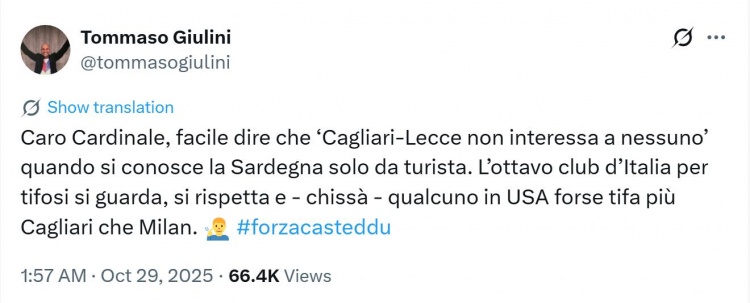 朱利尼写道:“亲爱的卡迪纳莱,当你对(卡利亚里主场所在地)撒丁岛的了解仅限于游客视角时,说‘没人关心卡利亚里对阵莱切的比赛’会很容易。作为意大利球迷数量排名第八的俱乐部,卡利亚里既有观众关注,也备受尊重。而且谁知道呢,在美国,或许支持卡利亚里的人比支持米兰的还多(注:在美国有很多来自撒丁岛移民的后裔)。”