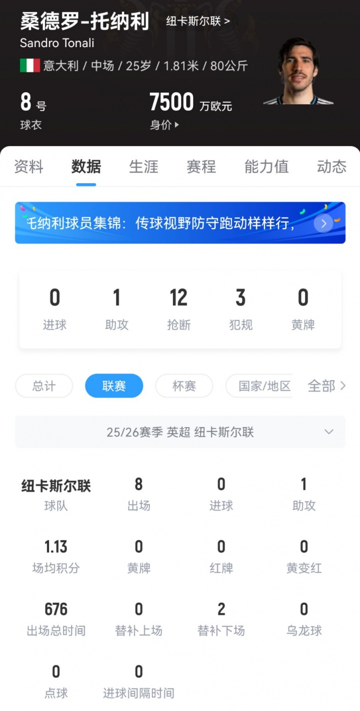 25岁的托纳利本赛季至今已经为纽卡在联赛出战8场比赛,贡献1个助攻,他目前的德转身价为7500万欧元。