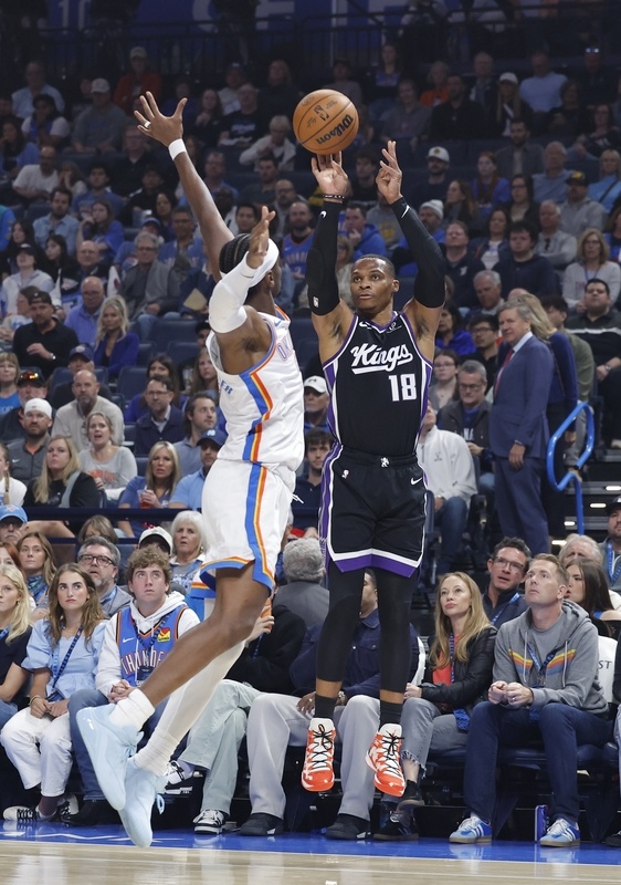 国王首发4号位基根-穆雷缺阵,此役又是威少重返俄城,国王主教练很懂人情世故,威少上首发,摆一大四小阵容:208公分小萨博尼斯+198公分德罗赞+196公分拉文+193公分威少+185公分施罗德